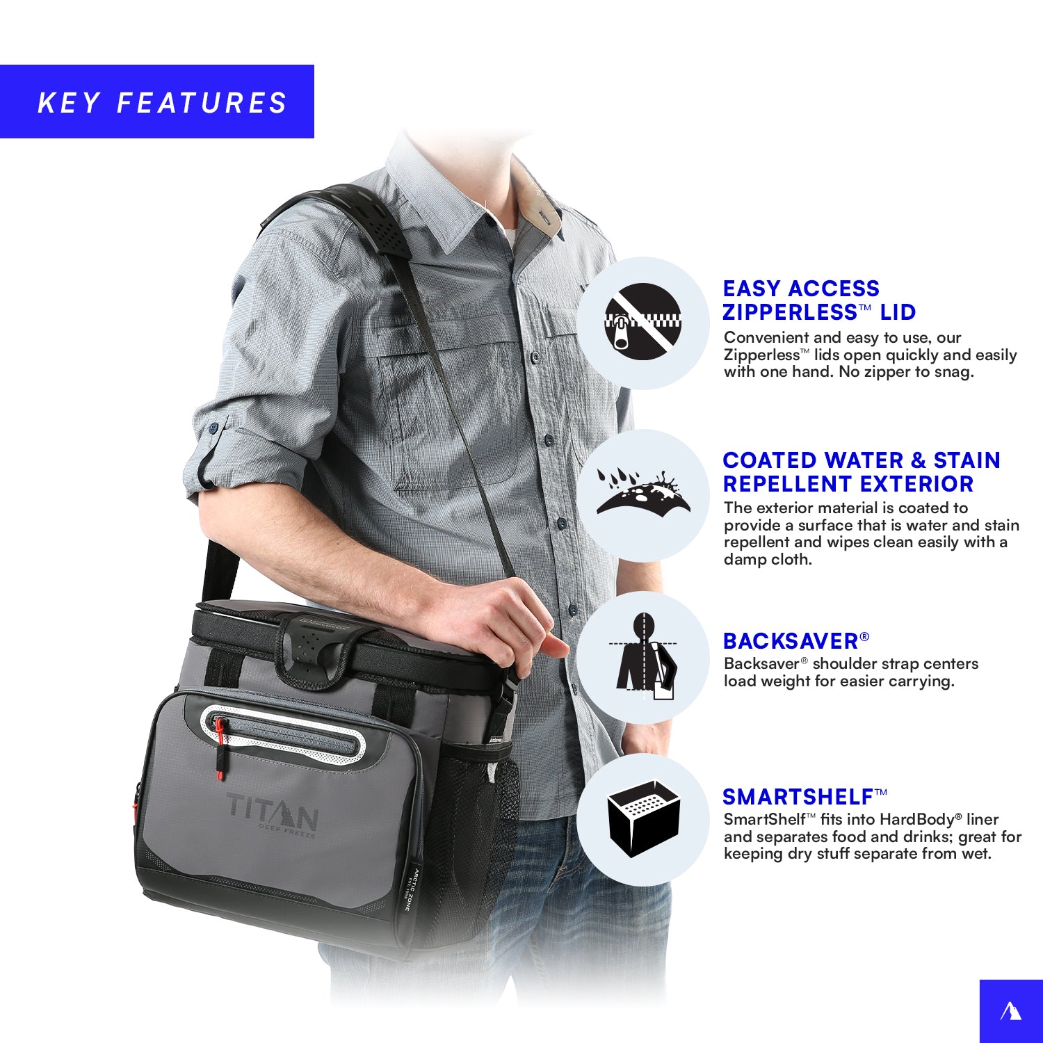 Designed for convenience and usability, this cooler also features an adjustable Backsaver® shoulder strap with anti-slip shoulder pad that centers load weight for easier carrying and a durable, easy clean, water and stain repellent exterior.