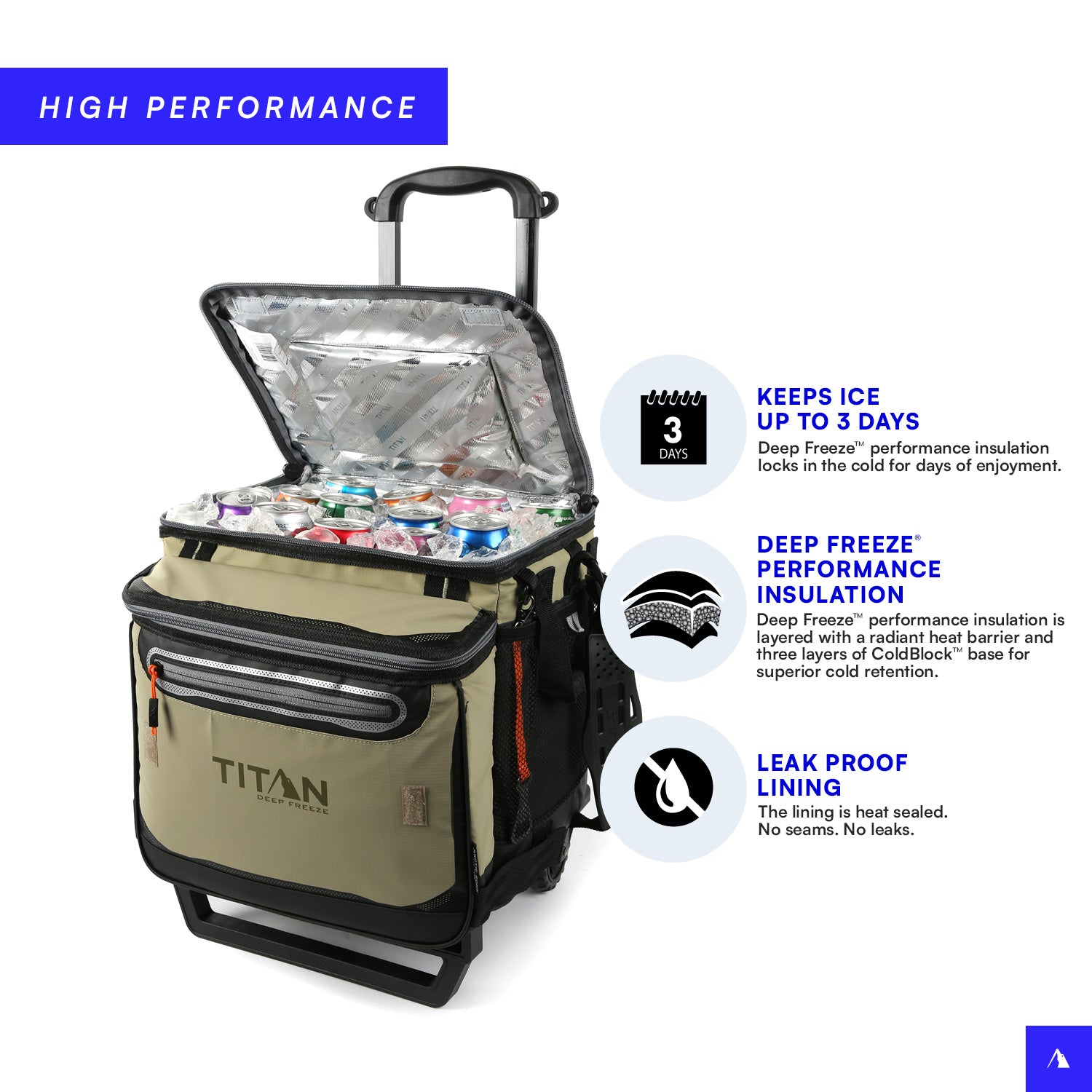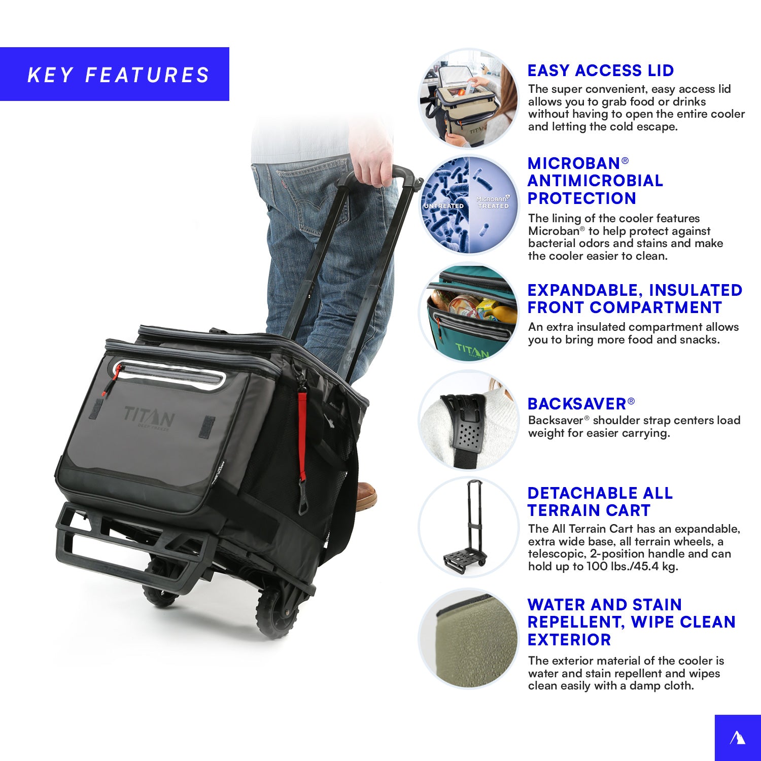 Keeps ice up to 3 days • Easy access lid • Deep Freeze™ Performance Insulation with radiant heat barrier • Leak proof, easy clean interior lining with Microban® • Expandable, insulated front compartment • Water and stain repellent, easy clean exterior • Detachable AT cart