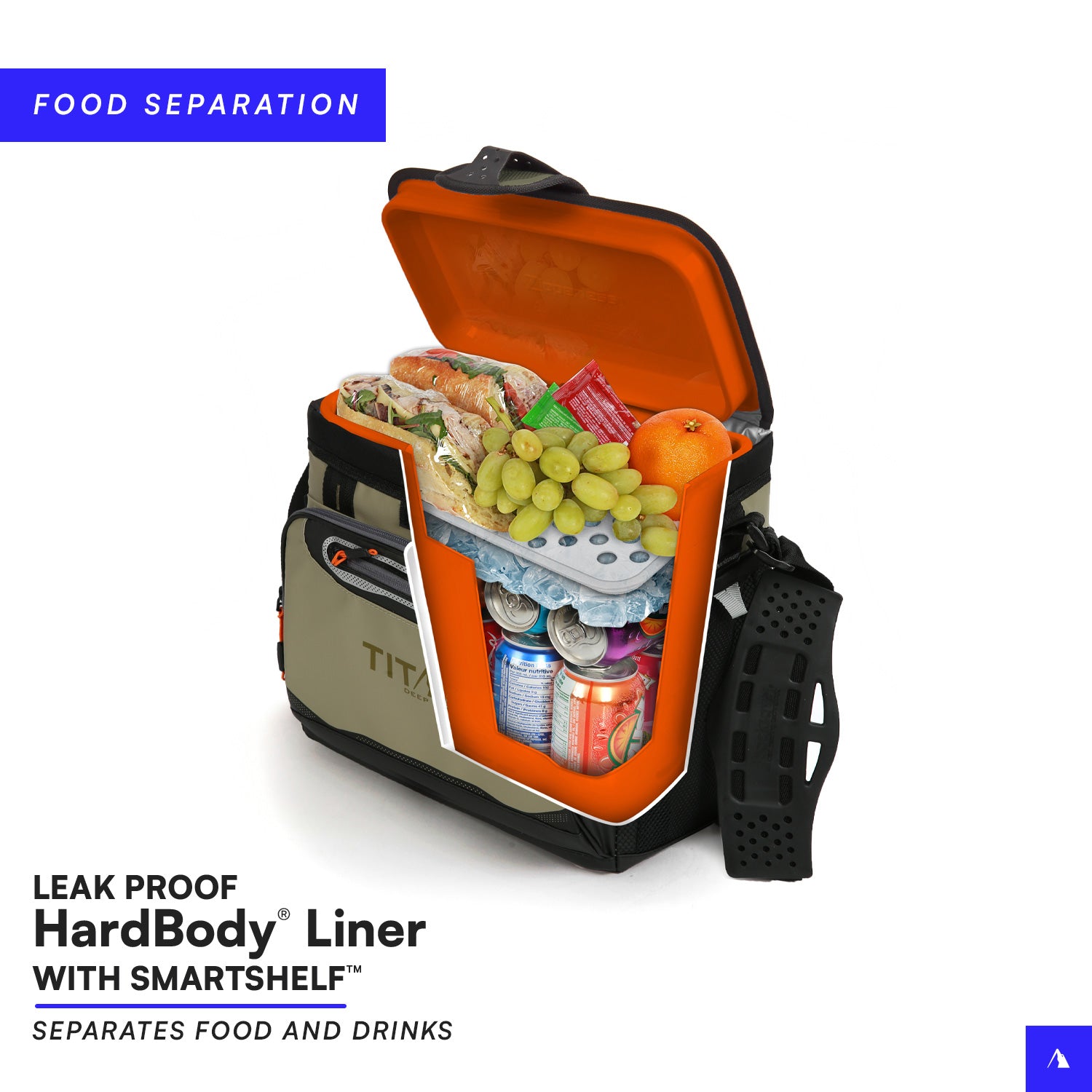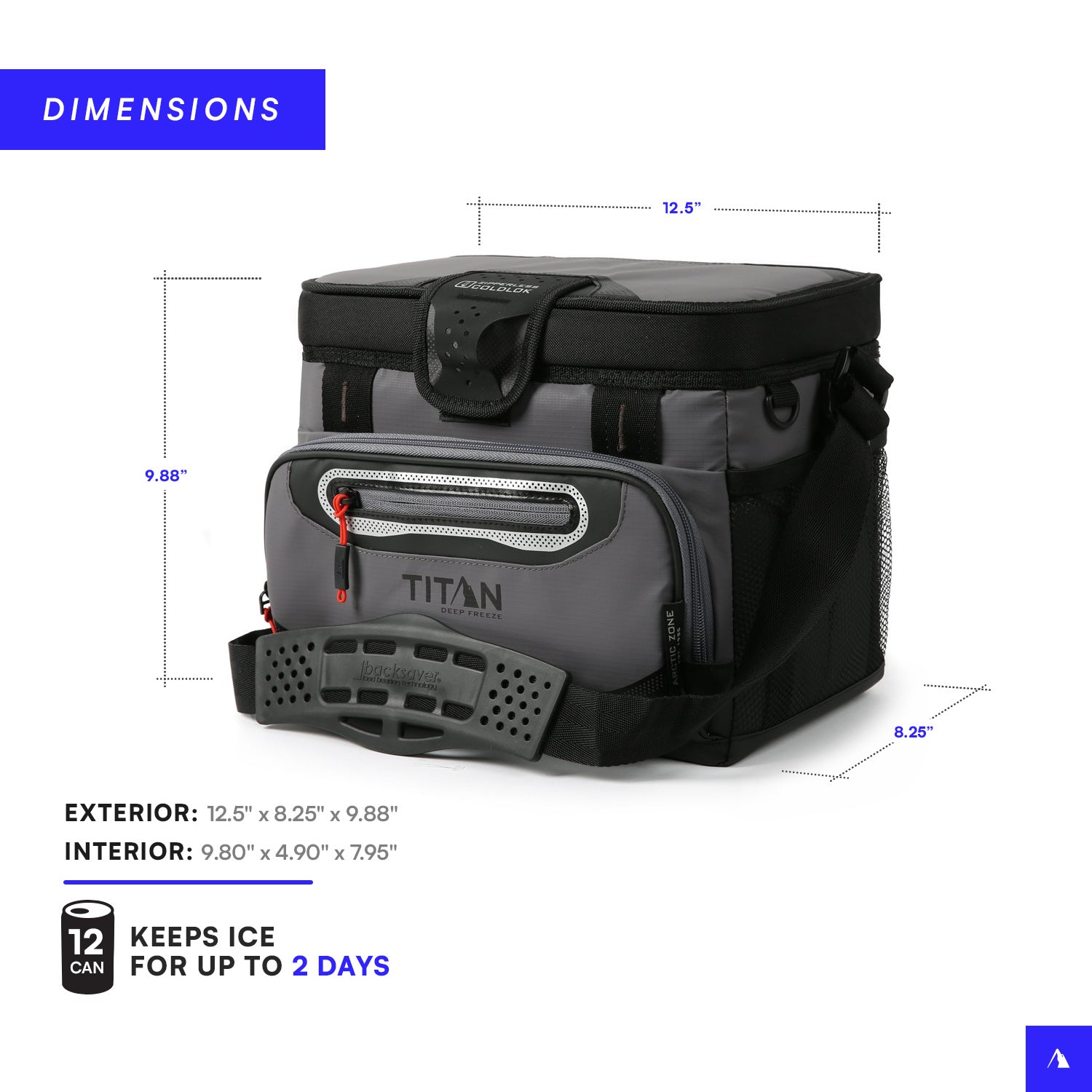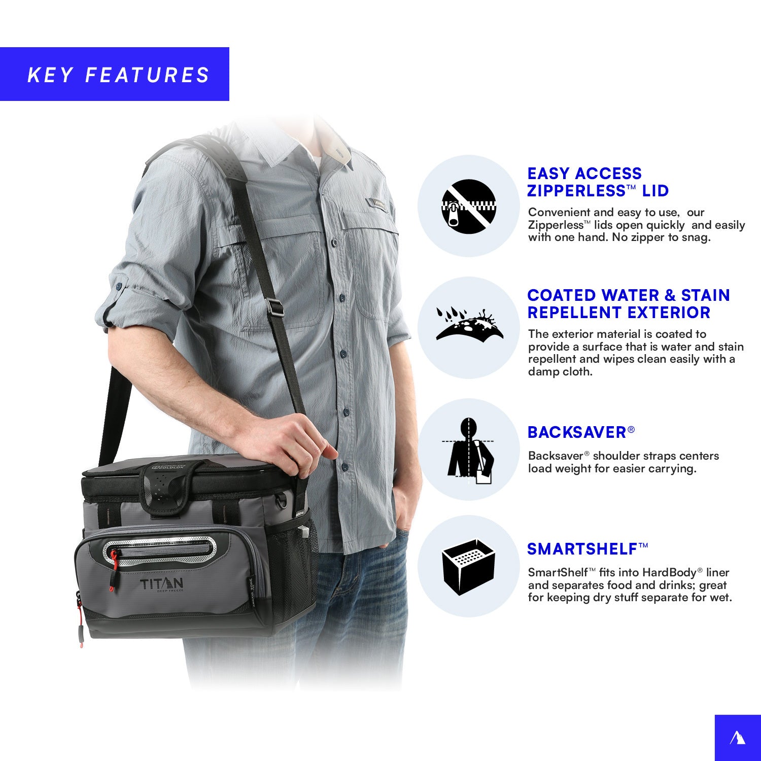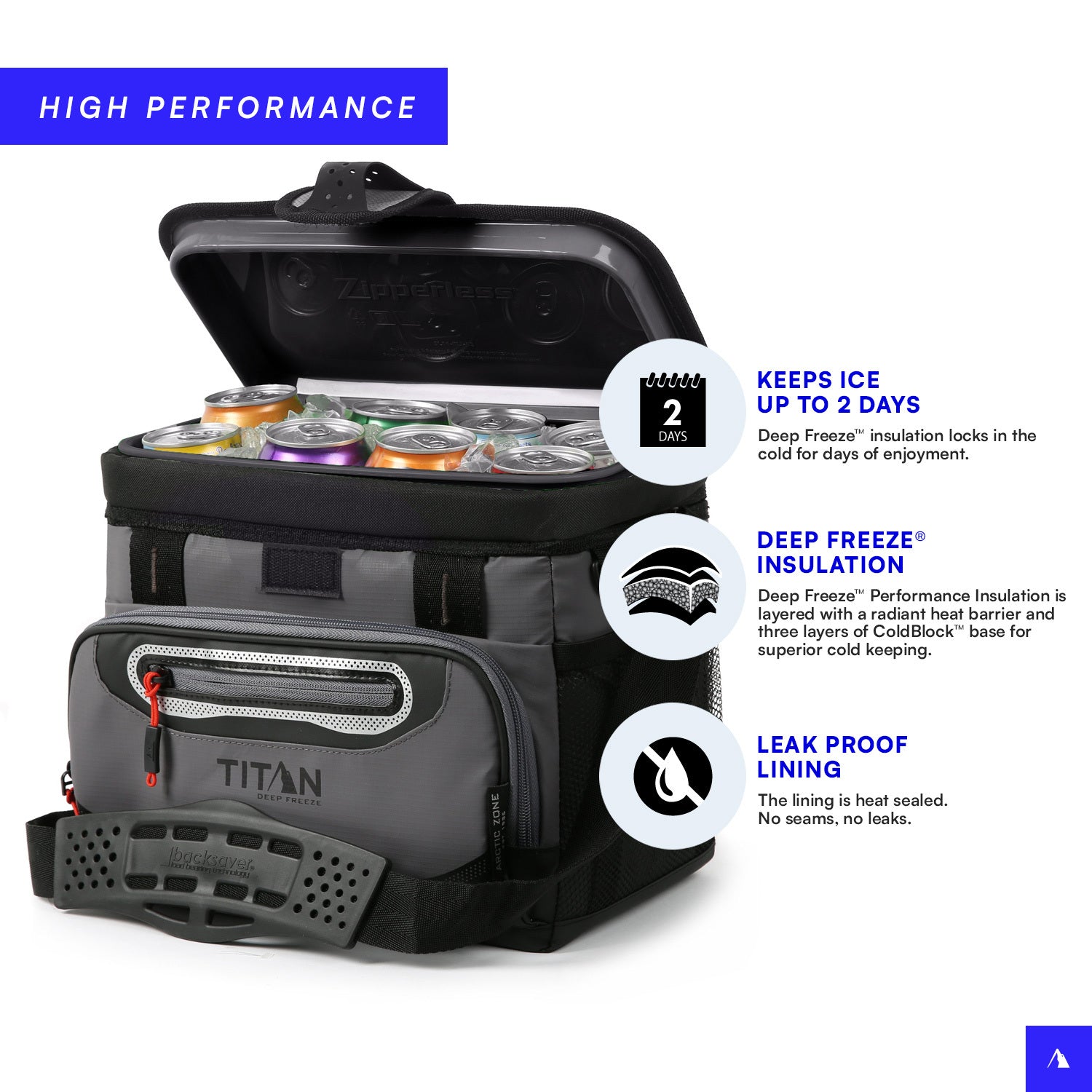 The Titan by Arctic Zone™ 12 Can Zipperless HardBody® Cooler keeps ice up to 2 days and includes a “flip-open”, patented Zipperless™ lid that provides quick access to food and drinks as well as an insulated front pocket.