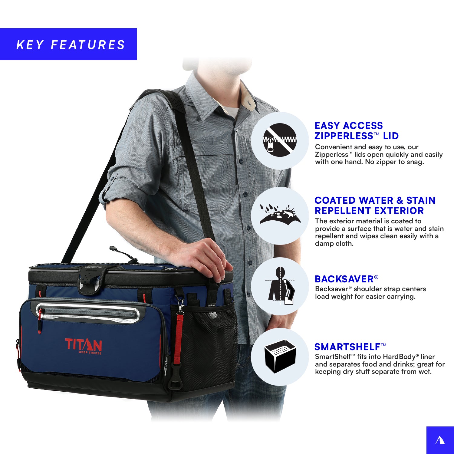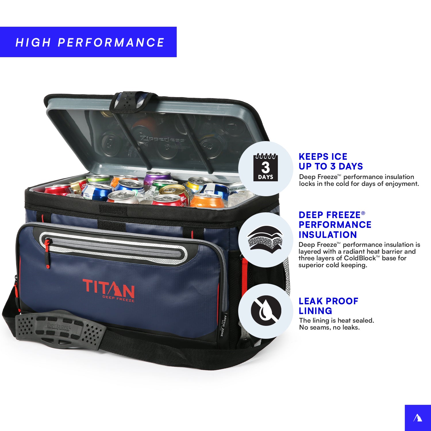 The Titan by Arctic Zone™ 48 Can Zipperless HardBody®Cooler keeps ice up to 3 days and includes a “flip-open”, patented Zipperless™ lid that provides quick access to food and drinks as well as an insulated front pocket.